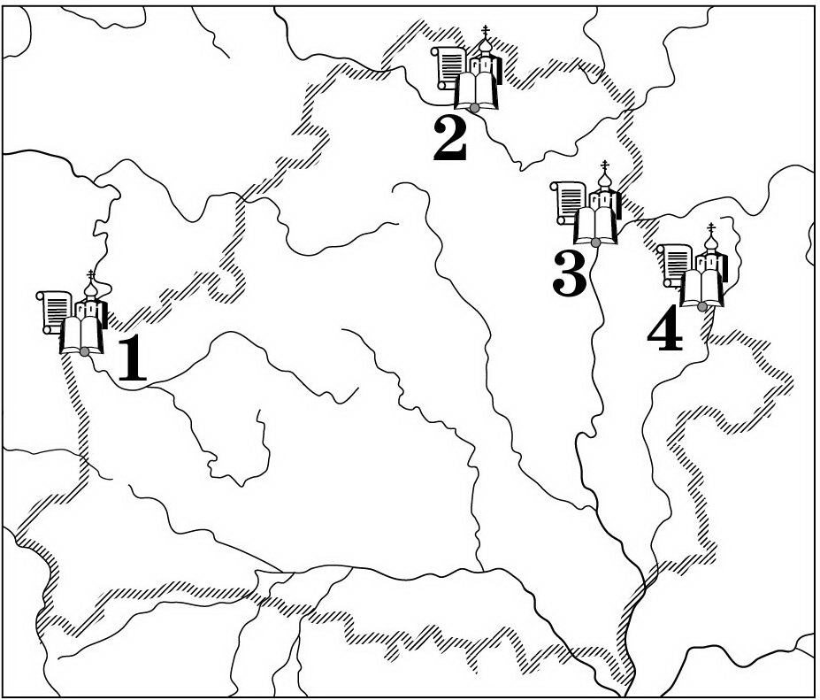 Соотнесите памятники культуры белорусских земель IX–XIII вв. с местами их размещения на картосхеме.