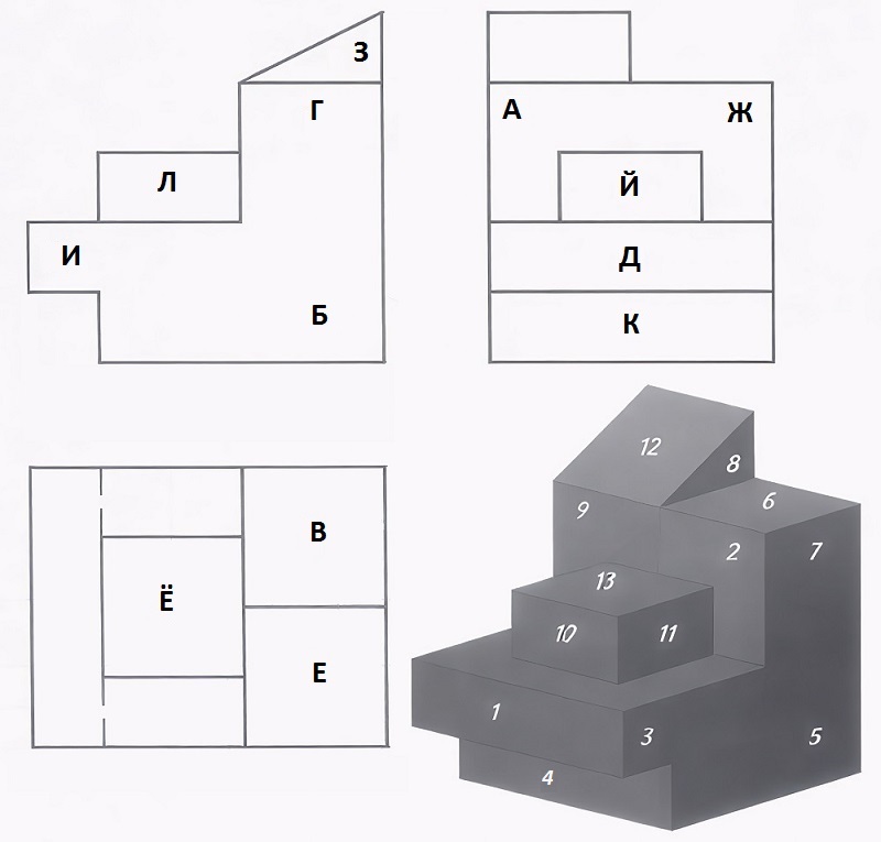 Определи какой грани, обозначенной цифрой на наглядном изображении детали, соответствует проекция этой грани, обозначенная буквой на чертеже?